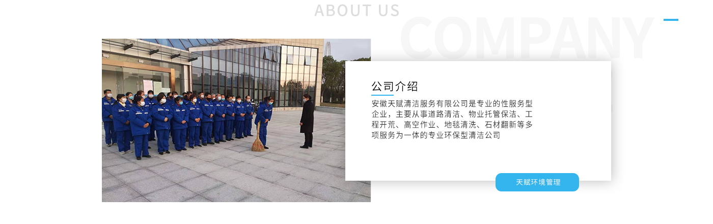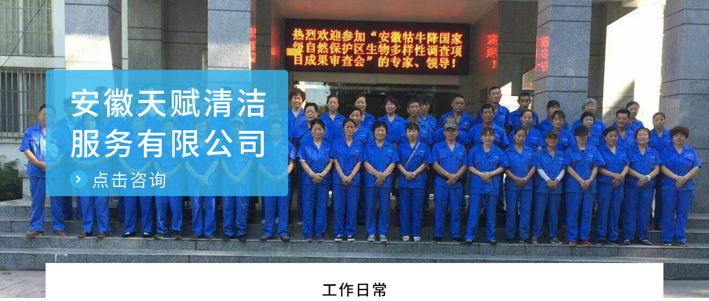 安徽天賦清潔服務有限公司是的服務型企業(yè),主要從事道路清潔、物業(yè)托管保潔、工程開荒、高空作業(yè)、地毯清洗、石材翻新等多項服務為一體的環(huán)保型清潔公司。公司管理機制完善,清潔作業(yè)經(jīng)驗豐富,擁有技術(shù)力量,嚴格實行崗前培訓—崗中督查—上崗在培訓的員工管理措施,憑著優(yōu)良的清潔質(zhì)量和嚴格的督查管理,為眾多企事業(yè)單位、醫(yī)院、酒店、廠區(qū)商場、物業(yè)、道路、學校、公園等提供后勤清潔服務。在業(yè)內(nèi)擁有良好的口碑。工作人員,服務態(tài)度優(yōu),竭力為客戶提供好的保潔服務。安徽天賦清潔服務有限公司:致力于長期合作關(guān)系,提高服務質(zhì)量,提供高標準的清潔服務。公司的經(jīng)營理念:為營造一個更清潔、亮麗的生活和工作環(huán)境而努力!“誠信”是公司成功保證?!翱蛻糁辽?,信譽為首”是公司宗旨。高標準提供服務,維護客戶利益、形象,是我始終不渝的目標。